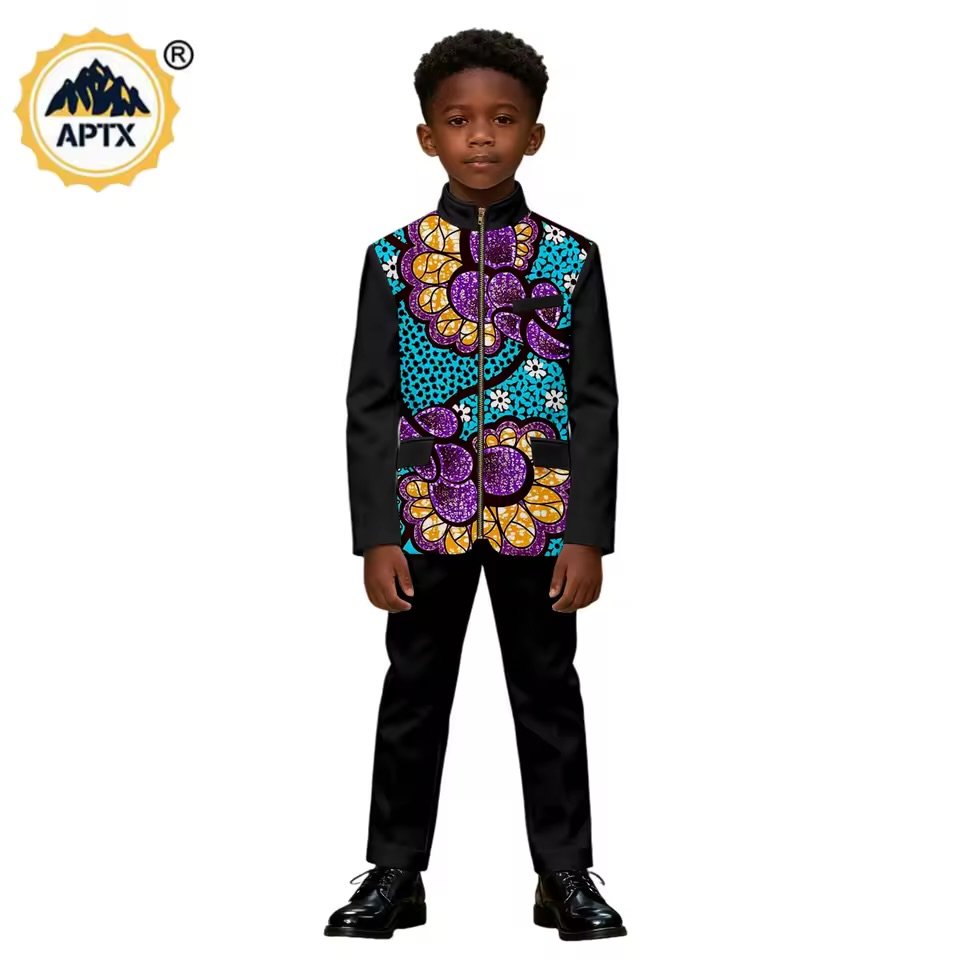 A bold and elegant African print formal set for boys featuring a structured zipper jacket with vibrant Ankara detailing and tailored black trousers. Perfect for weddings, cultural celebrations, fashion shows, and special occasions.